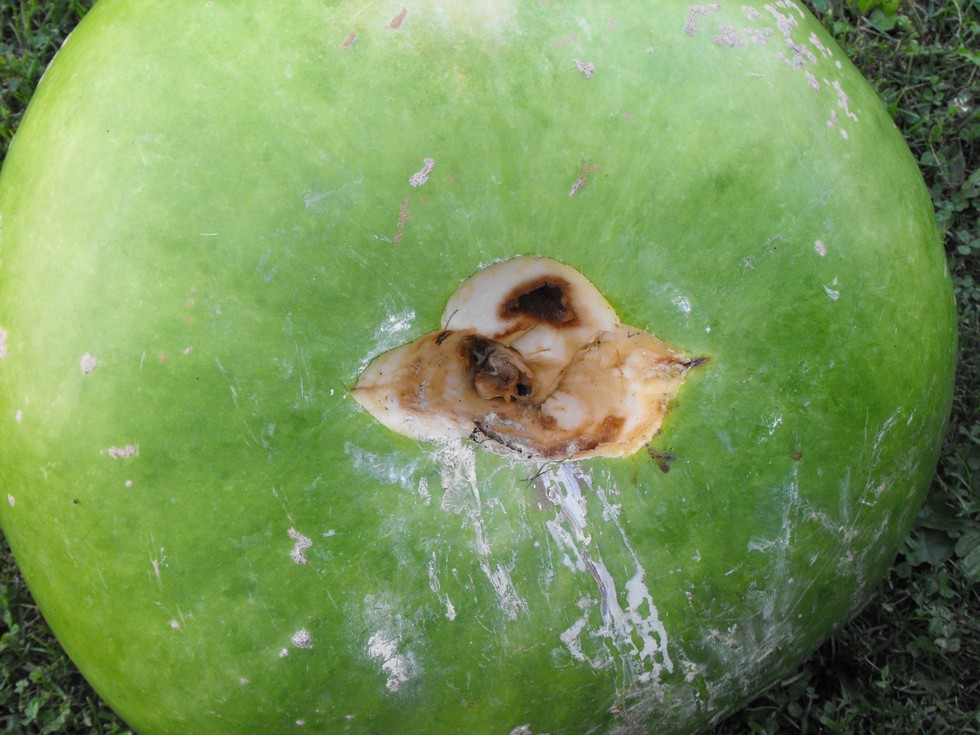 Yikes, 279.5 English bushel gourd, more rot than one could ever control and way too deep. The 130 Carey bushel gourd is still growing very well and appears to be able to hang in there the rest of the season.