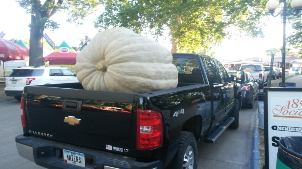 Got my pumpkin loaded up at the State Fair grounds and got it home today. Funny how this was "not" a nervous 2 hour drive because of bumps in the roadway coming back.Helped Marty Schnicker load the biggest salad I have ever seen in the back of his truck. Onions, Cabbage, Ag Pumpkin, Pie Pumpkin,Taters, Maters, Zucs, Gourds, Long Gourds with 3 Water Melons for a desert. I'm sure I missed something. Marty can grow anything.