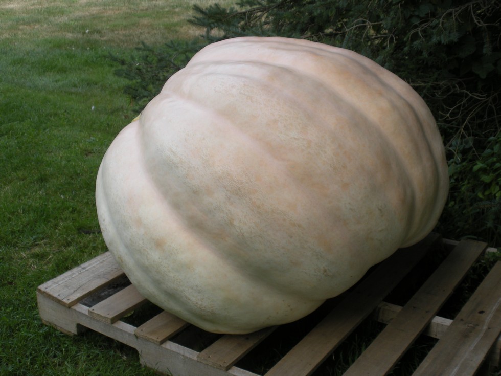 This is the 1245 Berard. I harvested it yesterday. For some reason the pumpkin stopped growing in mid to late July. After it stopped growing I did not put the time into it and the patch filled up with pigweed and lambsquarters. Some of the weeds are well over 6' tall. (Sorry no patch picture, it is too embarassing.) The pumpkin did split in the blossom end sometime in July but it never penetrated into the cavity. So this is a sound fruit. It's taping in the 550 pound range. It thumps like a rock. I am guessing it probably weighs in the 600-700 range. Thanks for the seed Al. I hope someone will grow a monster on the 1245 this year, unfortunately it won't be me.