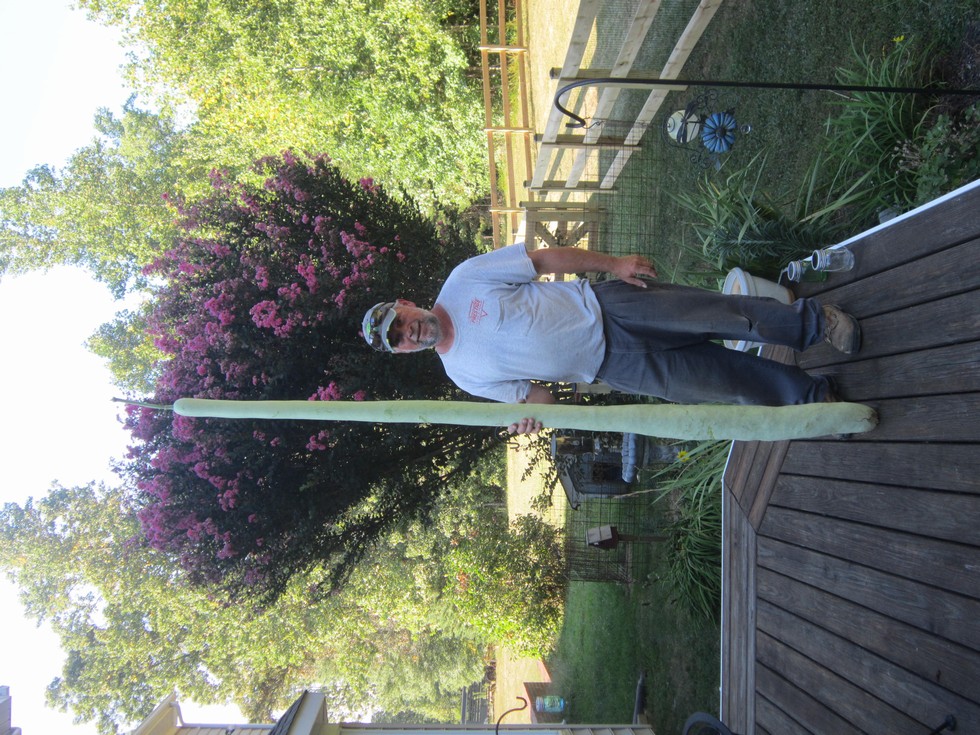 My longest gourd fell and ended up 94". It is a fat dude and weighed 27 lbs. Just too heavy for the stem and I will have to do better at tying them up. I have some late ones growing fast now that I hope to get over 100 inches.
