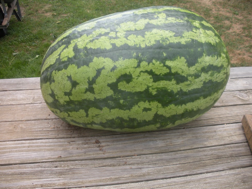 A nice little melon off the 191 Blair watermelon this was grown on a small side vine as an after thought. Maybe 85 pounds. I brought this to the fair to be carved by a man that shows up every year at the fair and does a carving exhibit. I have a bigger one on the 191 plant, it will probably go to Bethlehem next week. Nothing great in my melon patch this year. Too bad. The weather has been perfect this year for melons. Too many cucurbit diseases present in my soil, I need some virgin ground to grow on. On a bright note the eating melons have never been sweeter. I grew Jubilee, Willhite Tendergold, and Desert king. Not a bad year to try the Desert King, but drought resistance doesn't help too much if the plants weaken because of the wilt. Which they did. It takes some getting used to, eating a yellow melon, but the taste is very good.