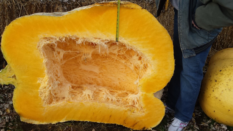 Time to update this diary and put it to bed. Here is the cross section of the 1333 (1566 Rodonis x 1714 -- that grew the 1921) 4% heavy. Small plant, started late, in a patch that had no preparation or extra care. If this pumpkin would have been in the main patch with all the goodies, I think it would have been a contender.