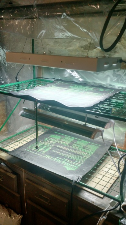 Cleaned up last year's mess, got the new 24" sun blaze T5 on the top shelf 85 degrees and climbing in my little starter house 63 degrees in the rest of the basement. You can find these little 2 shelf greenhouses at Menard's for around 17.00 really nice holding temps and humidity during the 1st couple weeks