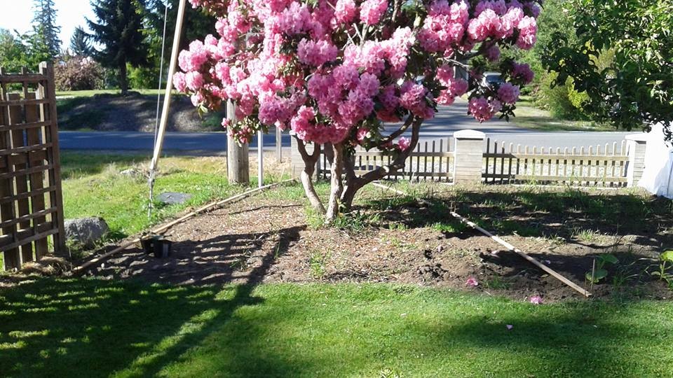 For the 150 SF contest, I am wedging it into a trapezoidal section with the rhododendron right in the middle of it. I will start the plant in the lower right corner and try to end up with the pumpkin in the shady area to the right of the rhody.