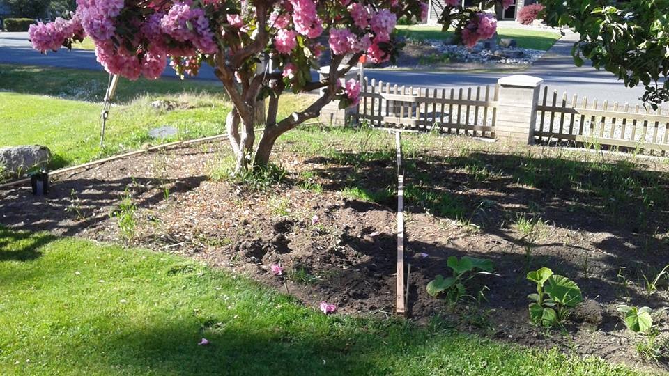 Last year i tried running my third plant in between the apple tree and the rhody and it was just too shady. This configuration should give plenty of morning sun on the front of the rhody and plenty of afternoon sun on the left side of the rhody.