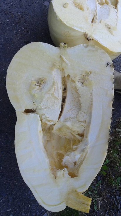 The pumpkin on the 2109 Zywiec aborted. I sliced it open and there was a pretty severe dill ring. You can see it on the left side of the photo. Chances are that even if it had continued to grow it would have split. It weighed in at 78 pounds on the bathroom scale.
