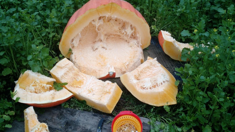 My 1734.5 Clementz x 2145 McMullen, cracked back in July, healed the crack. Loss the main next to the stem 1st week of August. Should have took this reddish orange pumpkin to a weighoff. Other than the stem barley getting soft she was in great shap. Lots of seeds to