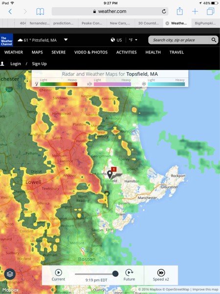 I am having very severe thunderstorms right now it's very dangerous. I had at least a dozen lighting bolts hit my house. I'm not joking about this. They almost hit my pumpkins. I'm scared. Driveway is flooding and streets are flouding.