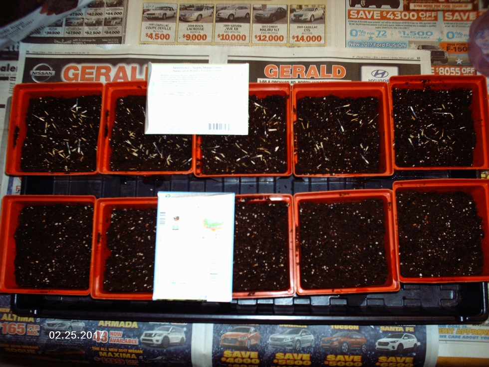 I filled each pot with 2 cups of the same soil mix used for my prior seedlings and watered well before seeding. At times, it may be difficult to see the seeds due to size, color and shape. The top row contains the marigolds and the bottom contains the geraniums.