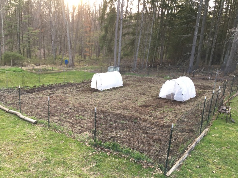 Hoops up. Lower half of garden still a mud hole. Might look into French drain to see if it helps.