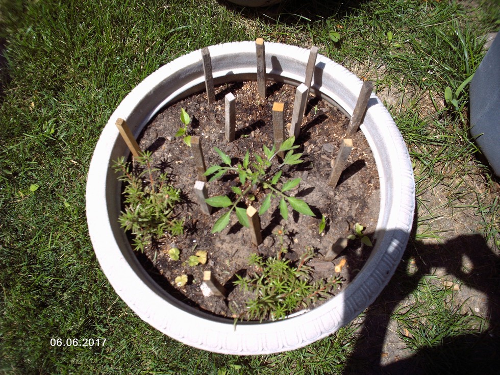 Bush Beef determinant tomato with moss roses, paint box geraniums, peppers and stakes for my crazy chipmunk friends!! They are eating all my onions and garlic!!