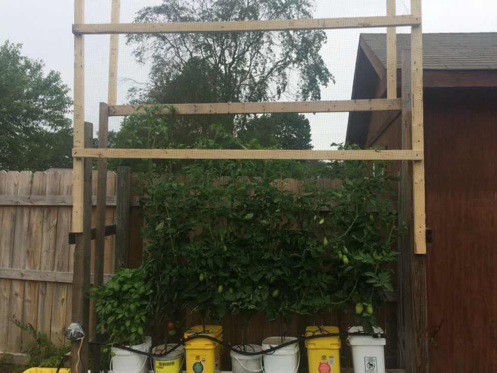 This is our hydroponic experiment for this year. We planted these plants on April 20. The middle crossing 2x4(the one the tallest plant is at) is almost 10 feet of the ground. This is 6 tomato plants(5 San Marzano and 1 Cherokee Purple) and a basil plant. We have already harvested about 15 gallon ziploc bags full of basil. I had to raise the trellis for the tomatoes up to about 17 feet. Maybe they reach the top by the end of the season. Also, all of the leaves on these plants are still dark green and plants look so healthy that I haven't had to spray the at all this season with an insecticide or fungicide. Anyone wanting info on our setup just shoot me an email it is really easy to build and maintain. We will grow all of our veggies with this system from now on!