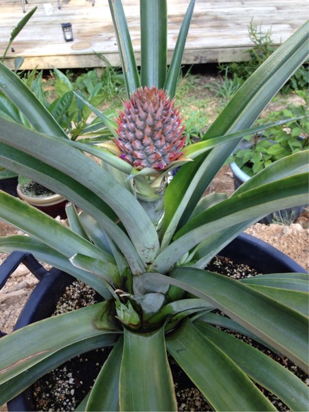 Number of people happen to be growing pineapples this year, here's mine just starting to bloom. This was grown from a cut top from a store bought pineapple, and is about 16 months old in a 30 liter pot. In February, an ethylene treatment was done and the spike began to show about 10 weeks later. Should take about 4 months for the fruit to mature, so right on time for the end of the season. Shame I saw pineapples for $3 the other day, but I'm sure this one will taste just like love. A good sign your pineapple is ready to go, are the pups at the base. If you look closely, it has already stated to split off for the new plants. These can be harvested and grown on, or left on the original roots.