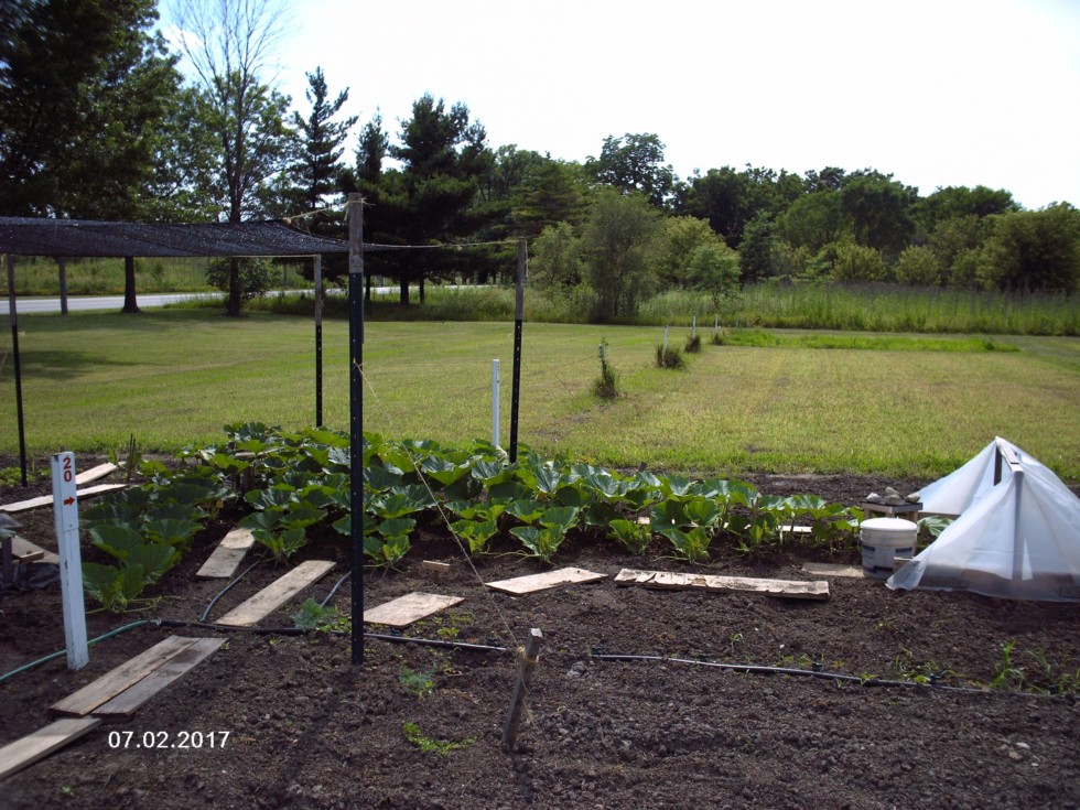 This is my Porkchop plant at 7 weeks old. A female blossom was pollinated where the white bucket in the picture.