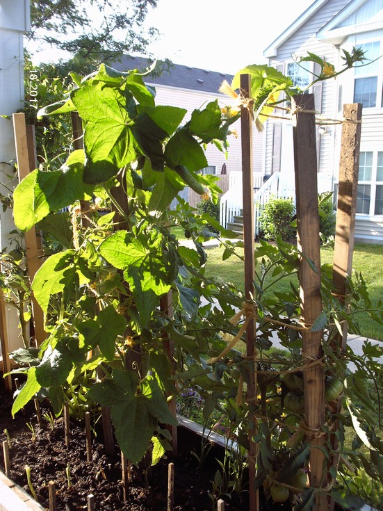 Flat Bush Beef Tomato on right, Yellow Boy in the middle with Space Master Cucumber. Lesson learned here is to plan on cukes to not be space spacers and put them on the end so your sons can help you stake them up with a trellis!!