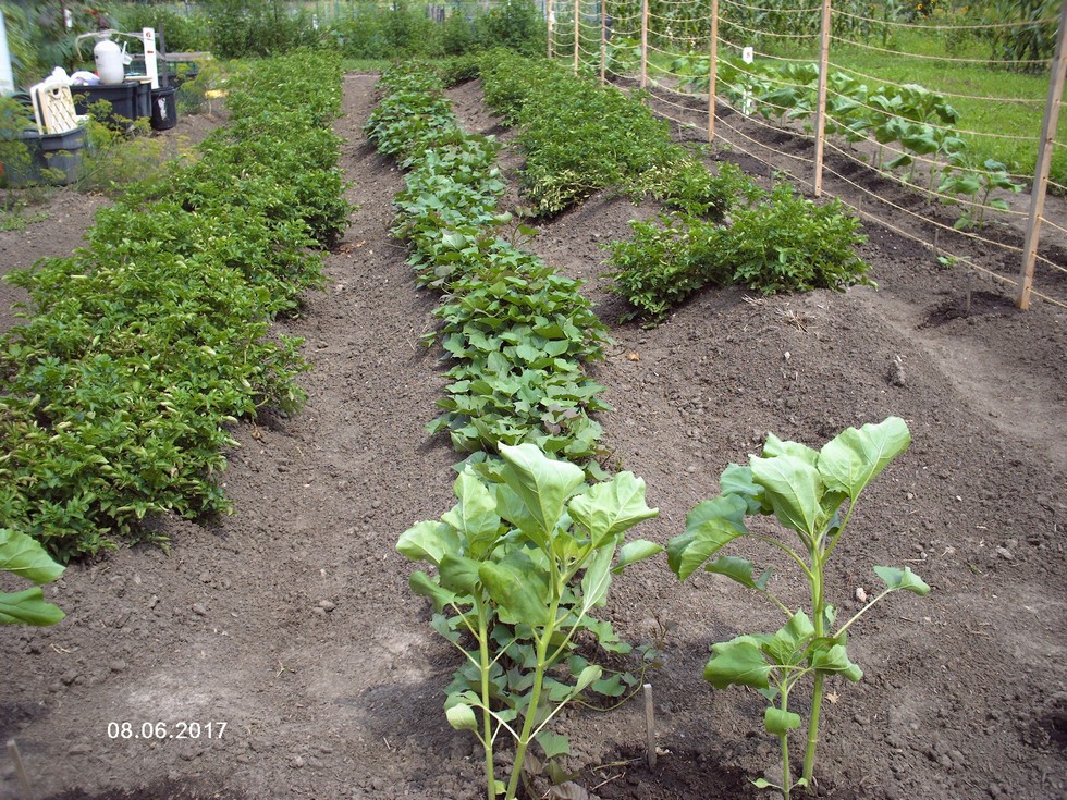 I just wanted to show the hilling effect. I have been in the past manually creating hills up to my knees, but now, my son uses a furrowing attachment on his tiller to help with my arthritis in the knees. I still use a garden rake to bring the soil up to their mounds throughout the season. I don't provide much water to the potatoes and sweet potatoes. They are searching deep now for water which is what I want instead of near the surface. I have had pretty good success with this method and have won ribbons at the Sandwich Fair in the past for their size and uniformity. They love a lower end pH and LOTS of aged compost. I also add in ALOT of saved up kitchen scraps, shredded newspaper and wood shavings. Also, wait to fertilize until the plants flower. Never, ever water over head!! Blight is a big problem for the late season tubers, so be gentle!