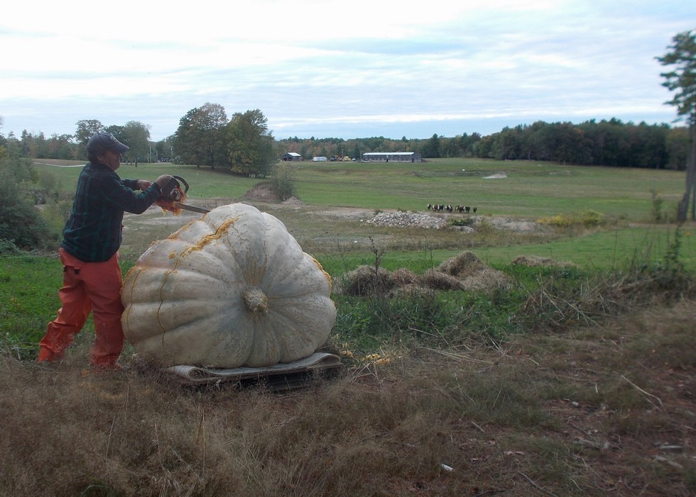 After the weigh-off I was offered to harvest the seeds and dispose of the flesh at Al�s place. This was certainly a unique seed harvest and I am very thankful for his help and generosity. He has some great pumpkin related helping tools. He pulled his skid steer right up to the trailer to unload the pumpkin, and then had a chainsaw and bibs at the ready.