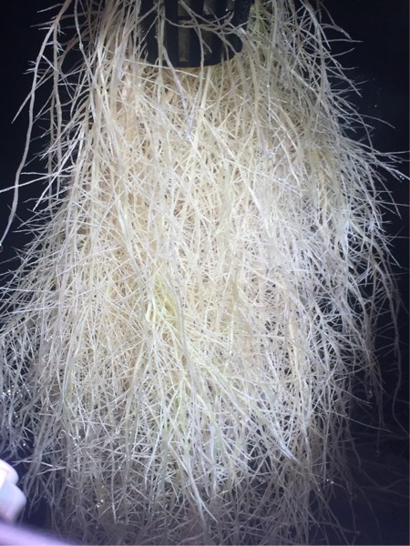 Aeroponic roots. I am getting better at determining the moisture level of the roots. Waiting for leaf flagging seems too late. In the past week have started misting longer and more often. Current timing-3 seconds on, 2 1/2 minutes off. Even though the root chamber is running 85 degrees during the day I am not seeing any signs of root disease. Before next winter, I intend to find a used thermoelectric wine cooler and utilize its parts for the aero tank.