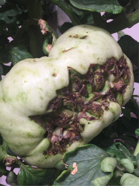 The aeroponic plant. At about day 7 DAP it started to show signs of blossom end rot. I sprayed the plant with calcium chloride and the BER is now dried up. You can see the scars on the bottom of the tomato. This tomato will grow rather flat due to the damage at the blossom end. Also the heavy foliar Ca spray hurts leaf quality. It measures 13 inches at 15 DAP. I am sure I will reach my goal of 1/2 pound for first try aeroponic, but probably not much more. Next year I think I can do better.