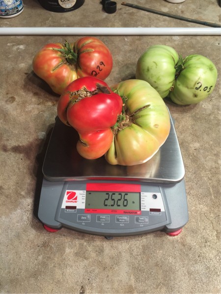 The last I picked was my best hope. I had given up on catching Dan S when this one flashed early. I still had hope that it could beat my indoor PB. Did not happen...only 2.53 pounds. Too strange shaped to get a good mFactor measurement. I am satisfied with my Jan 1st seed starts. With three tomatoes over 2 pounds I think that it is still possible to be competive with the late start.