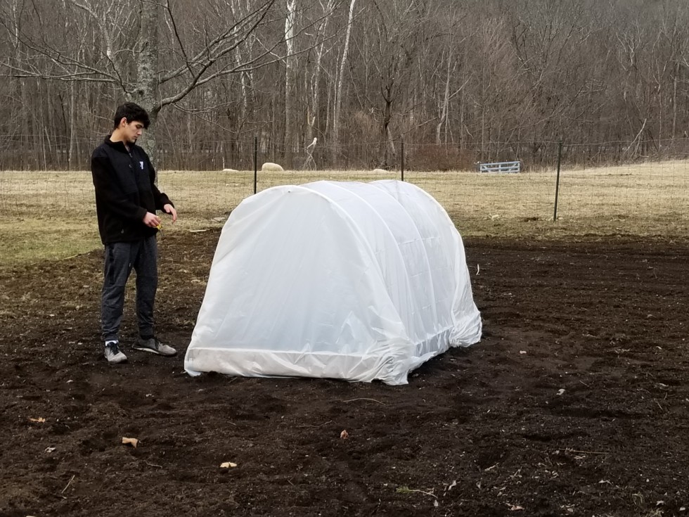 Hoop house up. After a full day in the sun the outside soil temperature (6 inches down) read 38�F whereas inside the hoop (6 inches down) it read 61�F. A few more weeks, and some soil cables and we hope to bring that to about 70-74�F