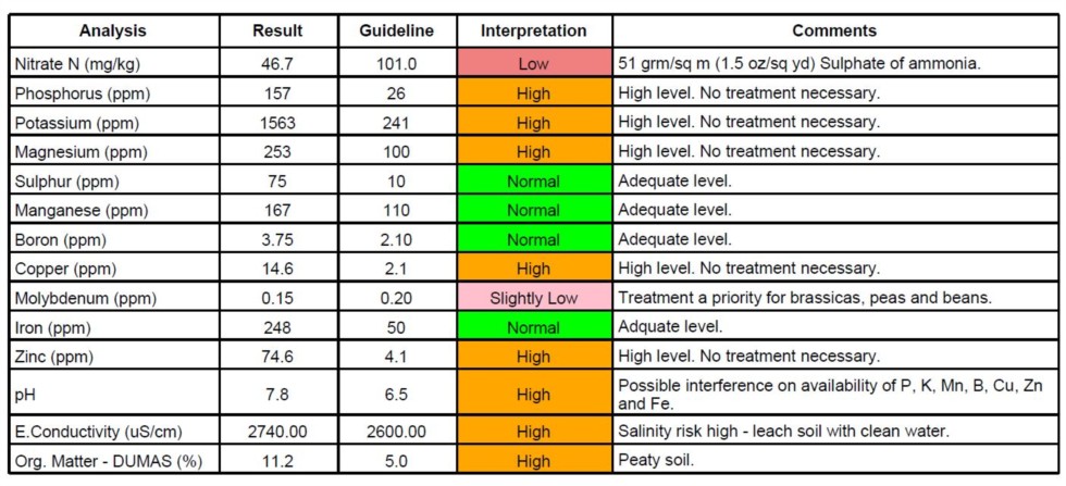 Here is the soil analysis as of now. Everything but N is high, which is easily rectified through adding ammonium, but I am a bit surprised as there has been 6" layer of cow manure on the plot for the past 6 months which I thought would have added some N. The other levels are high too despite nothing having been grown on this plot for a couple of years. As there is nothing I can do to remove the excess we will just have to deal with it. Same with the pH, sulphur chips may work in time but they are very slow.