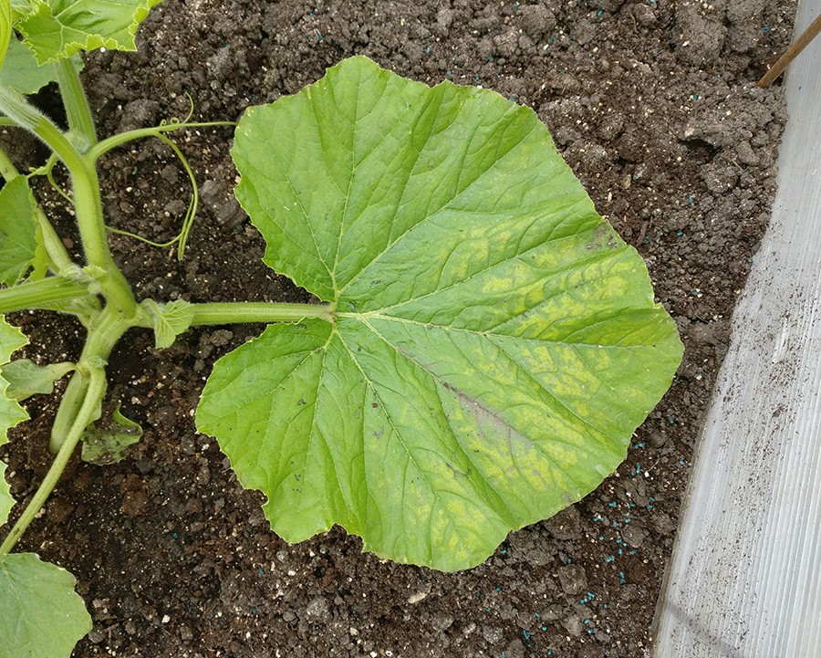 A leaf with some mild interveinal chlorosis, in fact all the leaves are lighter in colour than the dark green that I'd like. It's probably down to our alkaline soil, cold nights or transplant shock because there's plenty of iron & Mg etc in the soil, unless the ratios are wrong for uptake. In terms of treatment I'll give a foliar spray, I can't do much else.