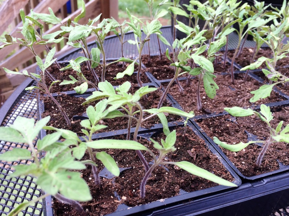 Tomato transplant day. Will transplant 40 then narrow it down to 30 for the garden. One little lowly 8.22 Porkchop Domingo remains. Two more came up but a slug got them! I have hope for this little guy. You wait, it will grow a monster.