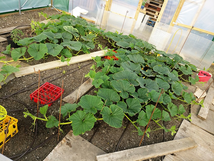 On the right is the 1949 which I'm curving round due to space limitations in the polytunnel. At the tip about 12 foot out is a perfectly positioned female that's pointing to the outside of the curve, see pic in the next entry. Maybe this is 'the one'? I gave the fruiting area a foliar dose of Ca chelate this evening with fulvic acid, seaweed, EC 2.0 pH 7.0.