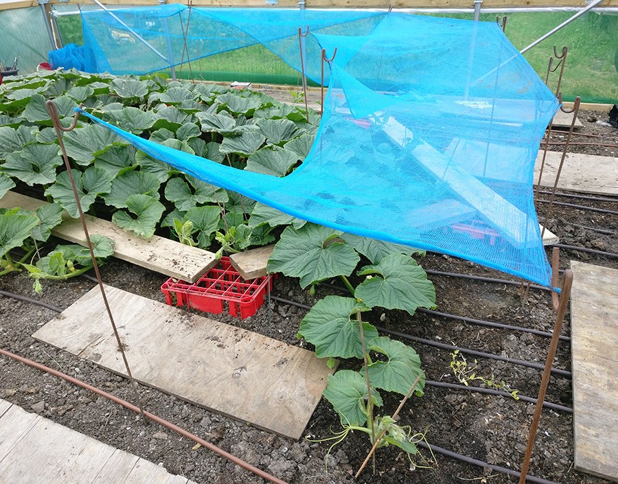 Shade netting put up this morning in an attempt to alleviate signs of sun & heat stress on the growing tips. Good news is that another female bud has appeared on the main vine which is now about 14 ft, hopefully it will develop properly as it's in an optimum position. Foliar spray with silicic acid and water pH 7.0
