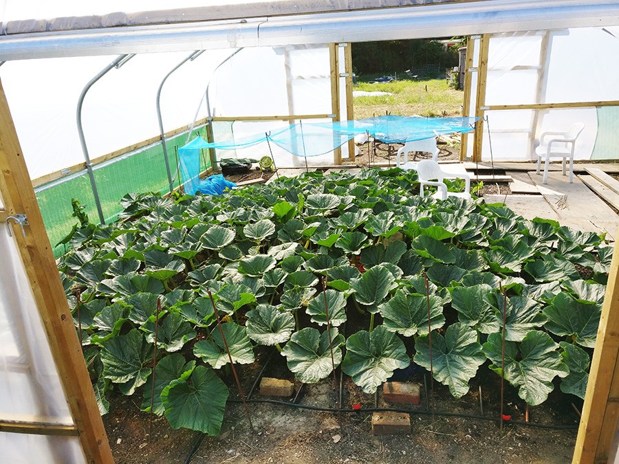 A quick view inside from stump end. I've terminated a few secondaries on the left side as they've hit the side wall. I'll be doing the same in a few days on the right side too. It should be pretty much full up in 2-3 weeks apart from the far end. The football sized pumpkin on the main vine is under the white chair at the end, and two smaller ones are on a couple of side vines to the right.