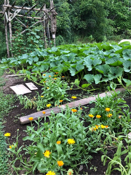 Hey wildcat, look familiar?.,,we planted every one of those companion plants you were talking about...these are the candulas.....our late long gourd is also overtaking the beans on the trellis...insane growth this week...