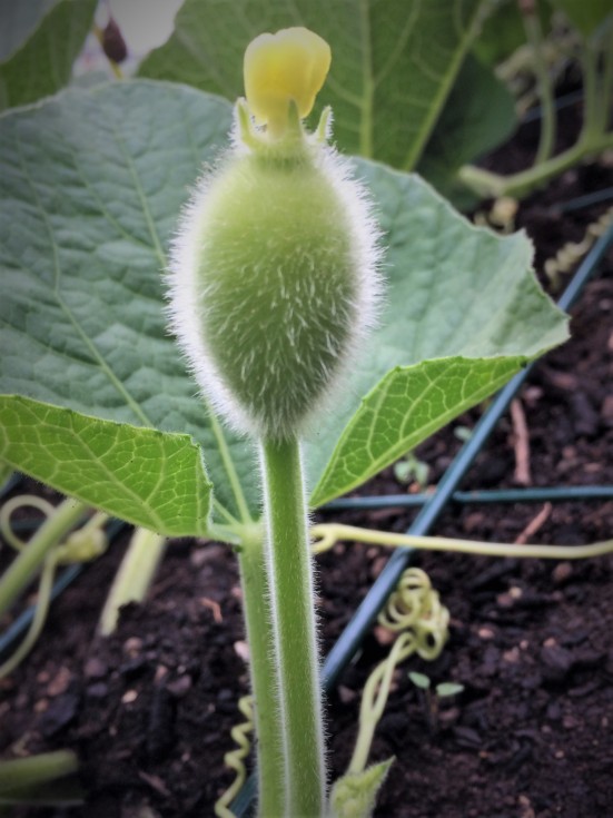 ...and I have a baby Bushel Gourd at about 2 dap. Wasn't there 5 days ago. Off the main on a secondary. On my 8' main this is only the 2nd female I have seen on the whole plant. The other on the main was deformed. Many many male flowers.