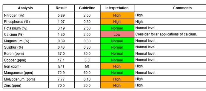 I took a leaf sample last week and here are the results, it's plain to see there's some Ca lacking so I did a foliar spray of Ca chelate last night and added some to the irrigation water. I don't expect it to make much difference as Ca isn't very mobile but it doesn't harm to try. I'd be more concerned if there's a deficiency in the pumpkin itself but there's no way of telling; as it is the skin is still smooth and supple with no signs of ripening or splits so let's hope for the best.