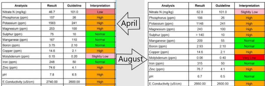 The latest soil analysis suggests that K is being taken from the soil at a great rate despite additional K having been added through the season, same with the EC being lower. The lower pH is great news, I wasn't expecting that to be so much given our chalky soil.