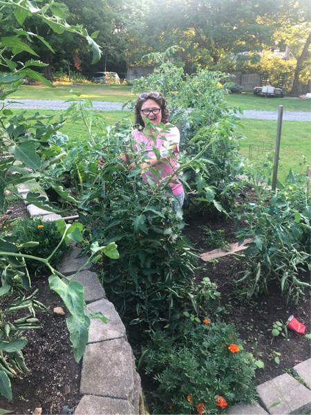 Look who finally tended to her plants!!!...oohhhhh...whudd ya find??...something good lambchop?....(I don�t call her lambchop btw..)...�something good lambchop?�....yea...guess who likes tomatoes now?...plant is staked up...shell prolly feed this week...she�s just using jacks classic bloom now...I think she�s fed 3-4 times this year...told her about topping plant ...still hasn�t ...