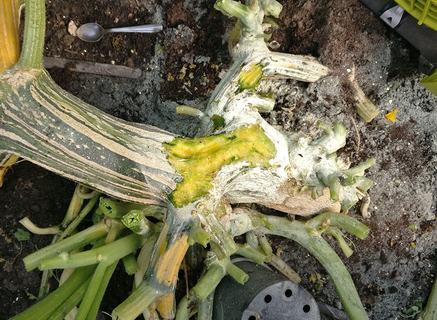 This morning I had a closer look in the light and stripped away all the excess growth. In retrospect I really should have been on top of that, I had no idea how crazy things were getting down there. So I dug out the rot which went into the stem about 1/2" at most, it was mostly superficial from what I could tell and didn't go that deep. Probably Fusarium of some sort, infection possibly caused by a combination of sudden cooler conditions, damp and poor ventilation. All I can do for now is dust with sulphur and ventilate with the fan. Today I will check out which fungicide products I can get which might be useful. I don't think the rest of the main vine or anywhere else is infected - for now at least. Pumpkin seems fine and I'll measure it tomorrow.