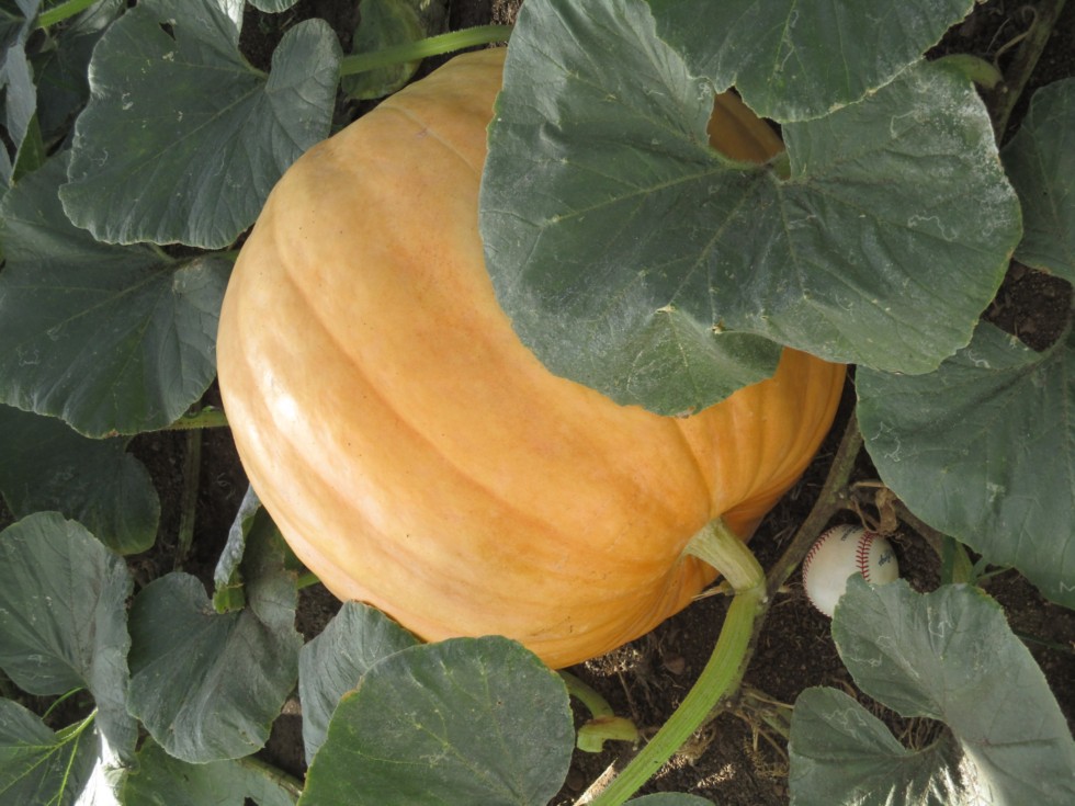 Big Max update, Joshua's fruit pictured with baseball for size comparison. Plant is getting mildew and aphids, but hanging in there. Pumpkin 85 lbs and still slowly growing. Joshua is excited to compete. We heard last years winner was 84 lbs, but he will be competing with kids up to 16 years old. He has a shot at 100 lbs, we'll see.
