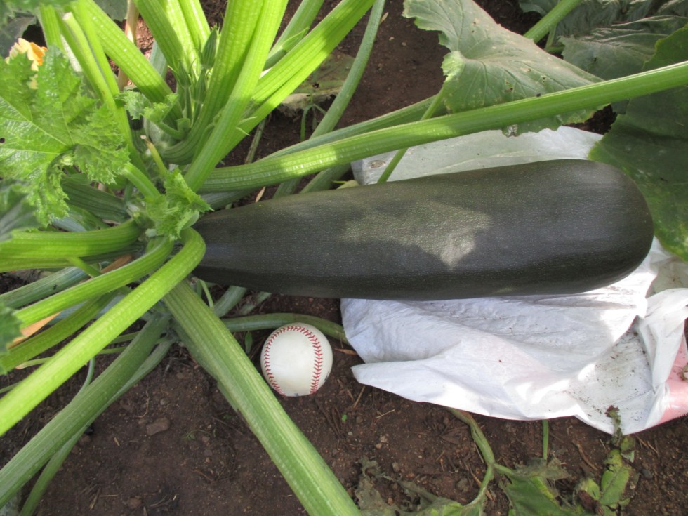 zucchinni is 11 or 12 days old from pollination, can't remember. Baseball for size comparison. I heard they grow 30 to 40 days, but being hot here, who knows. I will say I have no idea how big a regular zuche can get, but I heard the winners at the contest last year were 6 to 7 lbs. She is growing good so far!!!