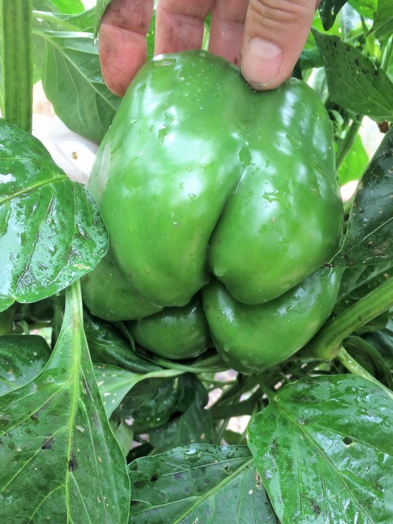 Time to pick this beast! From the Colossal variety. Like the tomatoes, don't know if I should pick when blushing or green. Picking it green this time.