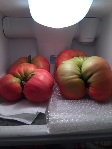 Going to find out storage length this year. These tomatoes vary between 1 1/2 weeks to a few days in storage. I shouldn�t be giving my competitors ideas but I am rotating the tomatoes daily. What was on the bottom becomes what is on top. On saturday will try the Konieczny recharge on at least one of these. One more hint...the front left is the 4.80 wixom slammer from my 3.02 that Wile witnessed being weighed.