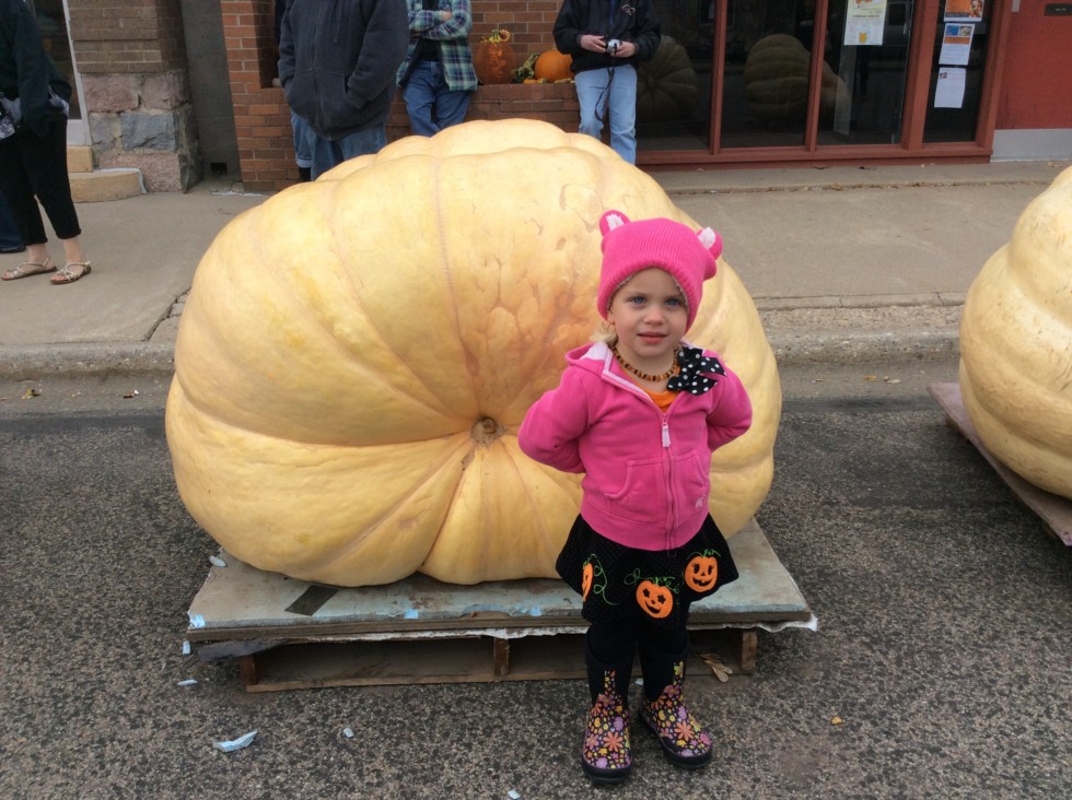 My Granddaughter Kyler with Chicken Nugget, 1st place winner 1237 pounds at our town pumpkin festival.