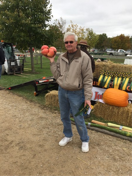 Here is the Larry Hill with his winning tomato at 7.66 pounds. It was grown on his 5.175 seed which was from the 5.30 MacCoy. I think he should look happier with going home with a thousand dollar check. It was great to see you Larry..hope we have many more years of friendly tomato competition.