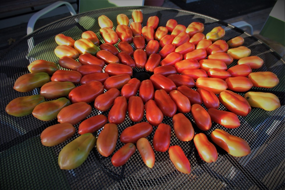 A batch of San Marzano tomato's. A type of plum tomato and best for canning. I cut them in half and put them on my smoker/barbecue for 6-8 hrs. They become half dehydrated and smoky. I use them for spaghetti sauce.