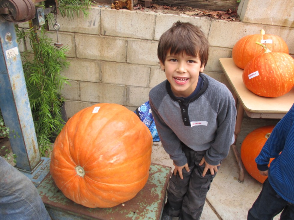 Joshua's fruit on the scale! Weighed 76 lbs, about 20 lbs under our estimate of 96 lbs. He took 1st place!!!!!