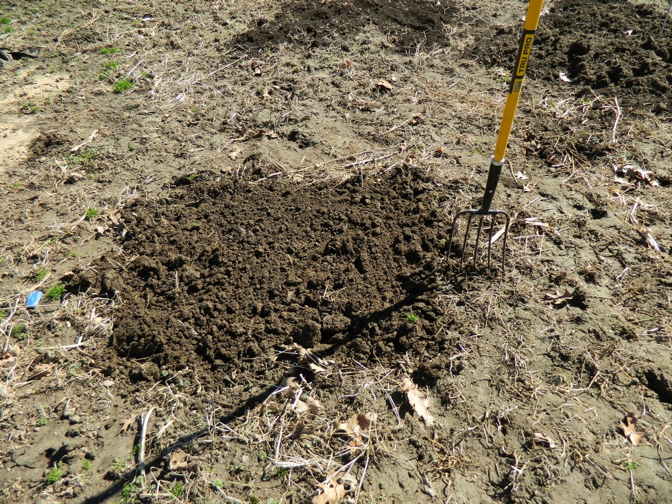 This is the same spot after I smacked the clods 1 times with the tines of the fork. Any clods that are left mellow out with the next rain. This method is easy on the worms, and the soil is full of them. Far more worms in the garden that in the timber right next to it. That type pf fork is not meant for digging soil, but it works in this soft soil, and it is much easier on my arthritic back that the short handled spading forks.