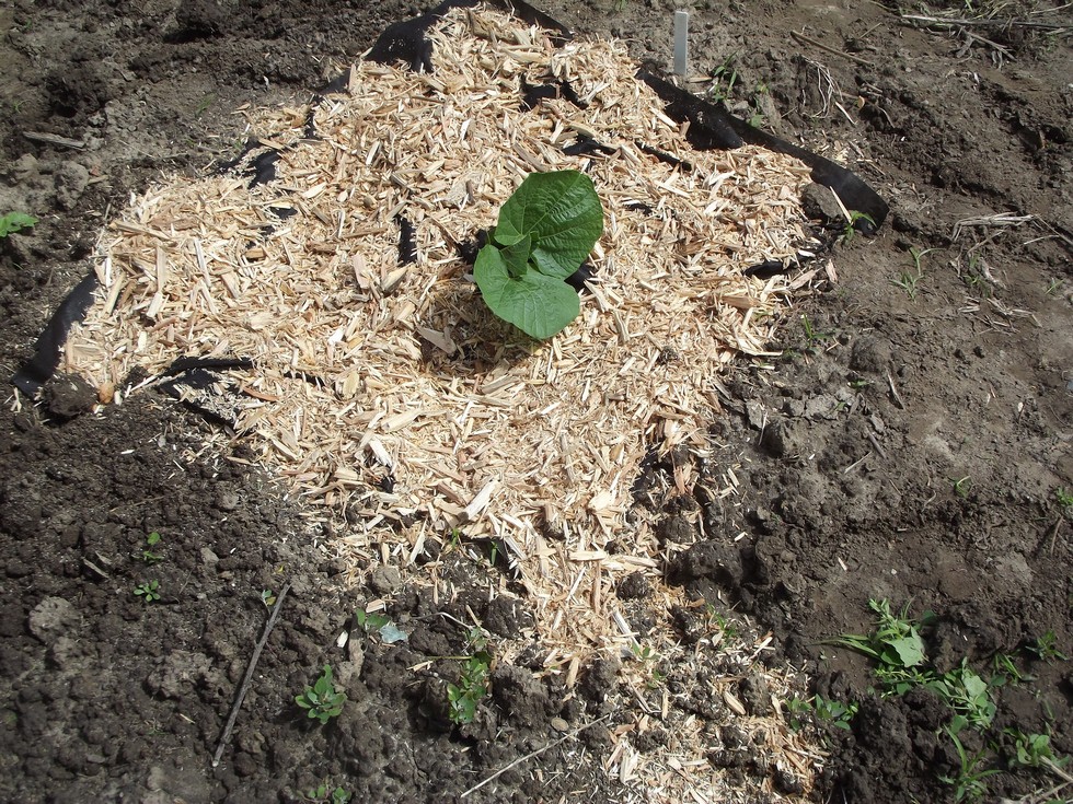 Something I am trying with the gourd plants this year. A 3' x 3' piece of weed fabric and wood mulch to hold down the weeds around the crown of the plant. I might try this on some field pumpkins too.