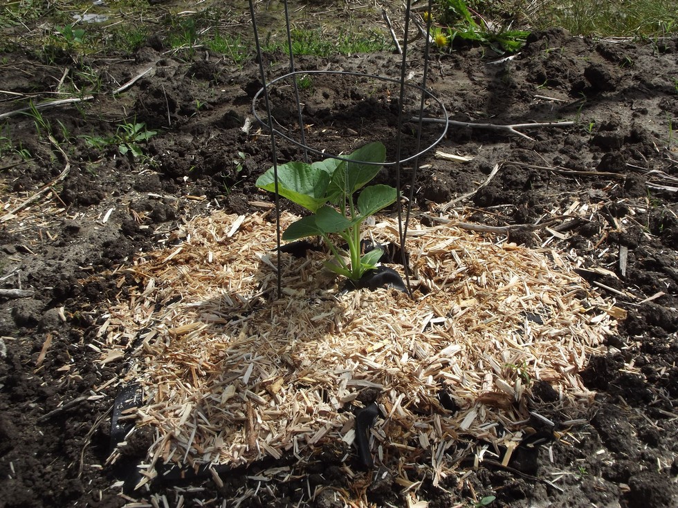 One of the long gourd plants. They start out climbing a tomato basket to get up to the trellis.