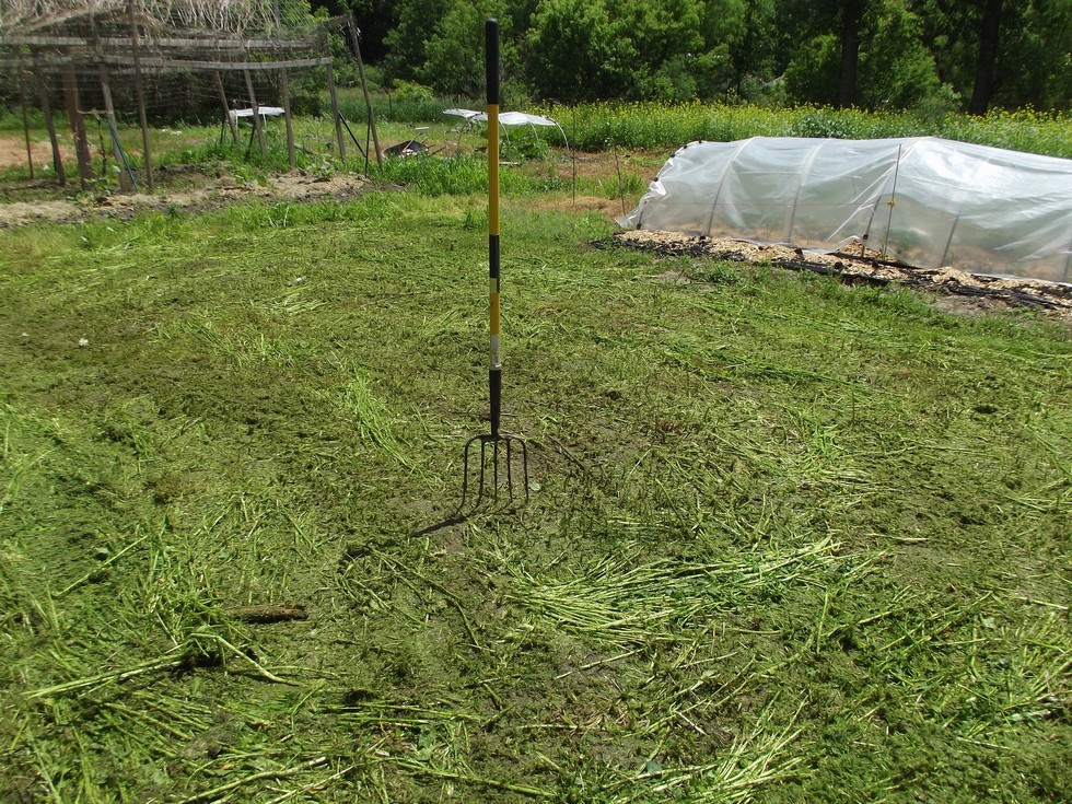 Mustard mowed, ready to be tilled under. With 2 of us working with our own pitchfork, it didn't take too long.