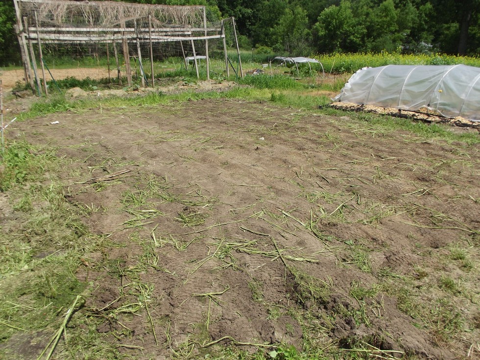 After we turned it over with the pitchforks, I ran over it with the mower to pack it down. Last year when I did it this way, I checked and the compaction didn't go as deep as you would think. I still have to water it down. It is drier than last year, when it was like packing mud and I didn't bother watering. By the end of the month, I will spray the weeds that start coming up, then plant Daikon radish and dwarf Essex rape. 2 ,ore brassica crops that fight disease.